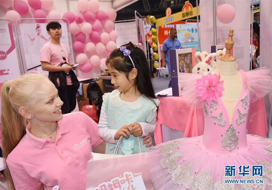 6月1日,小观众在一家俄罗斯舞蹈培训展台前了解培训课程。 “六一”期间,2019青岛国际儿童产业博览会在山东青岛举行。展会上,商家纷纷使出浑身解数,通过赠品、游戏、促销等方式“讨好”家长、争夺小客户,童展经济竞争日趋激烈。 新华社记者 李紫恒 摄