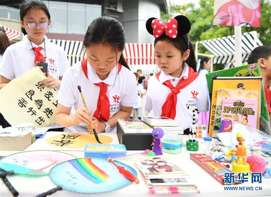 6月1日,参加创意集市活动的小朋友在现场创作用于售卖的书法作品。 当日,重庆市南岸区文化馆在南滨路举办“六一”创意集市活动,小朋友们在家长的协助下准备了丰富的美食、玩具、图书、书法作品、自制手工品等进行售卖,吸引众多市民和游客前来选购。 新华社记者 王全超 摄
