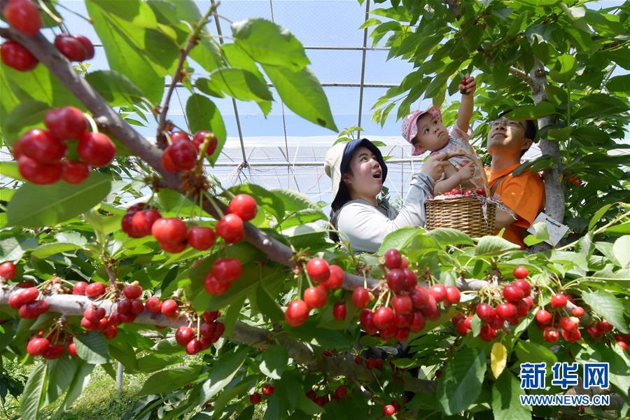 6月1日,游客在河北省滦南县倴城镇霍泡村的樱桃种植园采摘。 近日,河北省滦南县倴城镇霍泡村500余亩樱桃进入成熟期,吸引游客前来采摘、游玩。 新华社记者 牟宇 摄