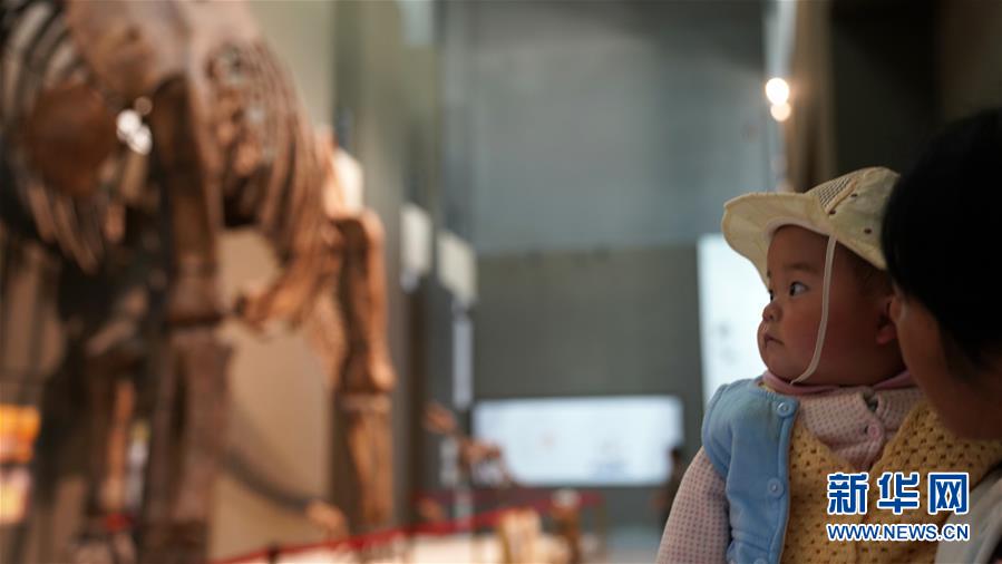 6月1日,一名女子抱着孩子在甘肃省和政县的和政古动物化石博物馆参观。 当日是“六一”国际儿童节,不少小朋友来到甘肃和政古动物化石博物馆参观,学习古生物知识。 新华社发(李梦馨 摄)
