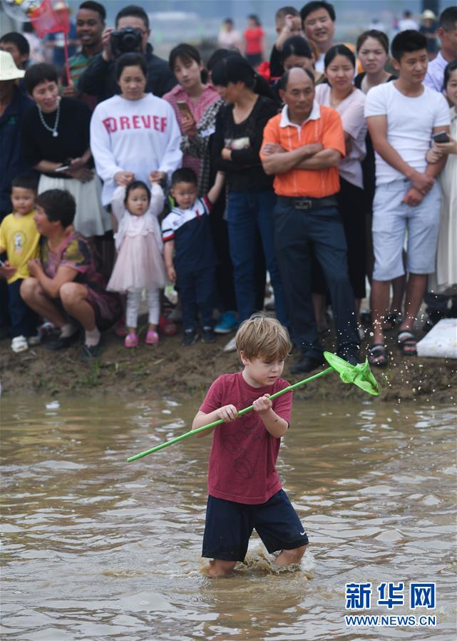 6月1日,一名外国小游客在红旗村的稻田里参加水田摸鱼活动。 新华社记者 徐昱 摄