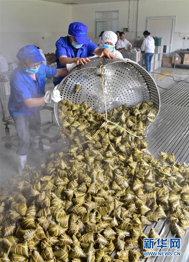 6月1日,工作人员在秭归县一家食品加工企业生产车间赶制粽子。 端午节临近,屈原故里湖北省宜昌市秭归县的食品加工企业加紧制作独具特色的各式粽子,以满足市场需求。 新华社发(王辉富 摄)