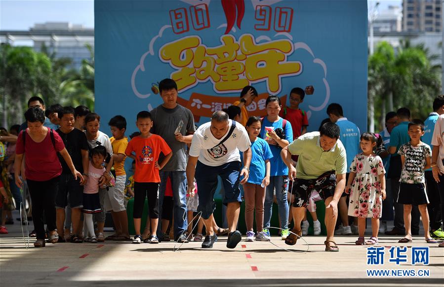 6月1日,家长在海南省博物馆滚铁环。新华社记者 郭程 摄