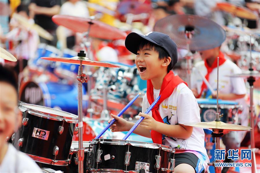 6月1日,小朋友在江苏省无锡市滨湖区万达广场表演架子鼓。 新华社发