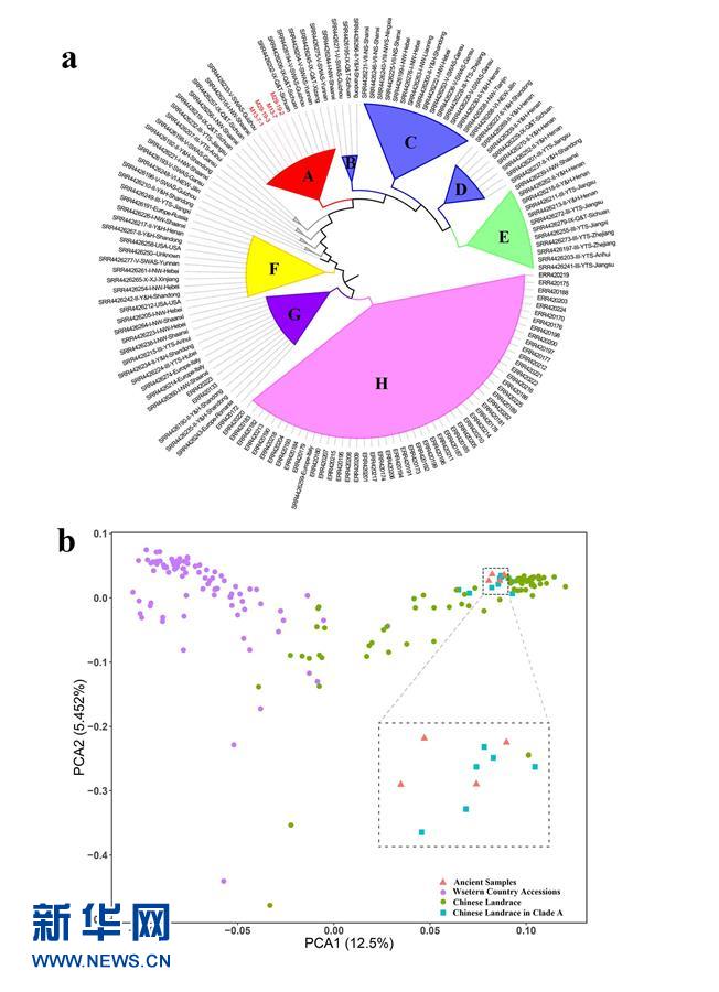 这是现代小麦地方品种与古代样本的基因组数据的系统发育和聚类分析图(吉林大学生命科学学院、吉林大学边疆考古研究中心教授崔银秋提供)。新华社发
