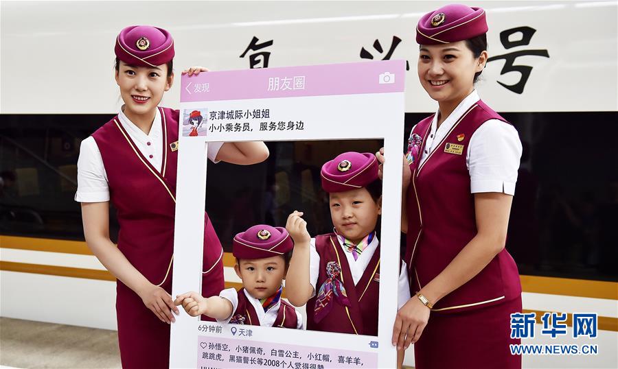6月1日,孩子们与乘务员妈妈在天津站与列车合影留念。新华社发(杨宝森 摄)