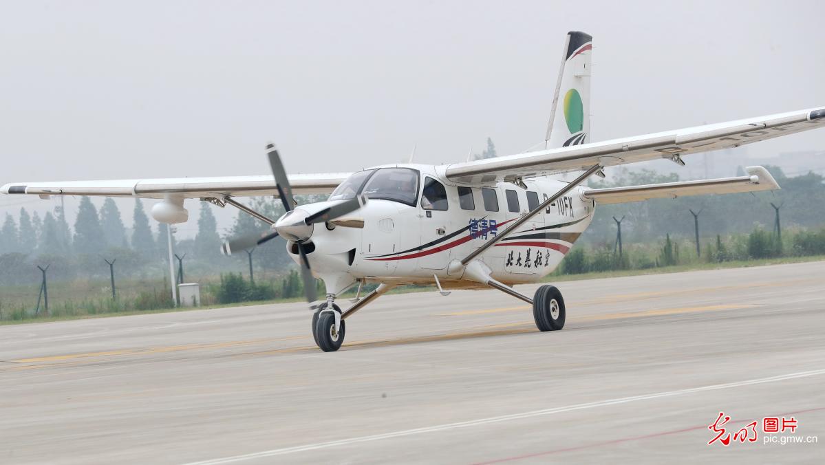 2019年6月1日,一架大棕熊K-100型飞机在浙江省湖州市德清莫干山机场整装待飞。当日,浙江低空快线"德清—舟山""德清—横店"两条运输航线首飞,这标志着浙江省首条短途运输航线在德清正式开通。(谢尚国摄/光明图片)