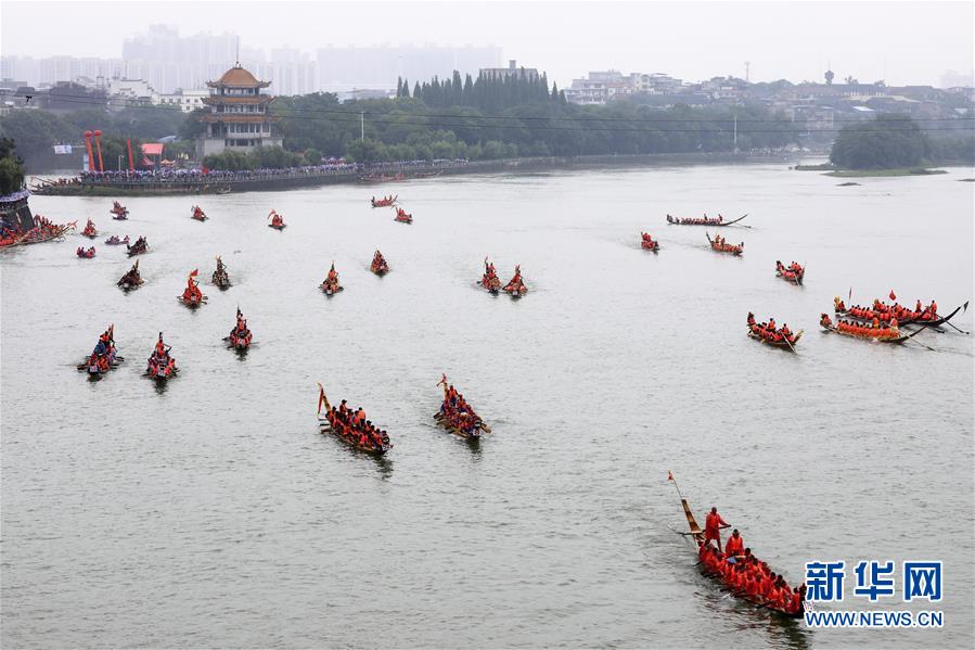 6月1日,人们在湖南省永州市道县潇水河上划龙舟。 端午节临近,多地举行龙舟赛喜迎端午。 新华社发(王滋创 摄)