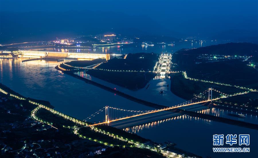6月1日拍摄的三峡五级船闸和三峡大坝夜景。新华社发(郑家裕 摄)