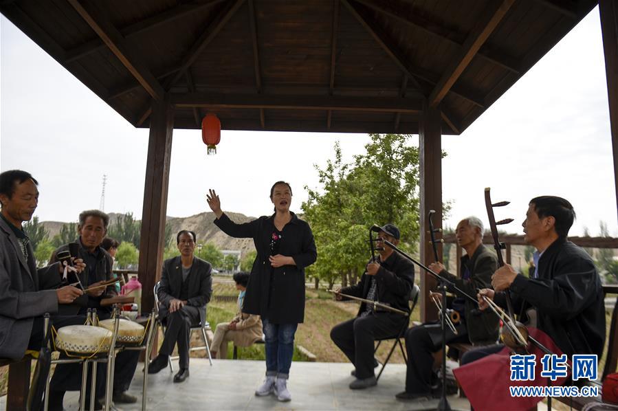 当地村民在金沟河畔的凉亭中表演秦腔(5月29日摄)。新华社记者 冯开华 摄