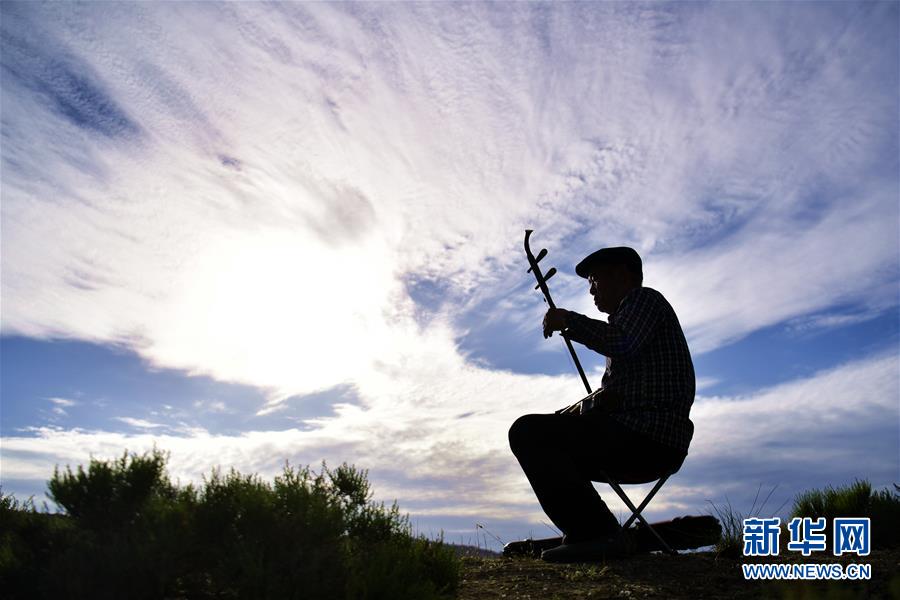 强有雷在强湾村山坡上拉胡琴(5月29日摄)。新华社记者 张龙 摄