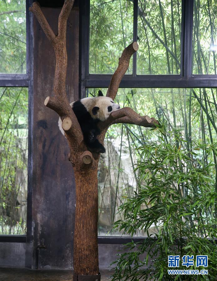 6月1日,在上海野生动物园,大熊猫宝宝“七七”在树上休息。 当日,上海野生动物园举行命名仪式,宣布一只10个月大的大熊猫宝宝被正式命名为“七七”。 新华社记者 丁汀 摄