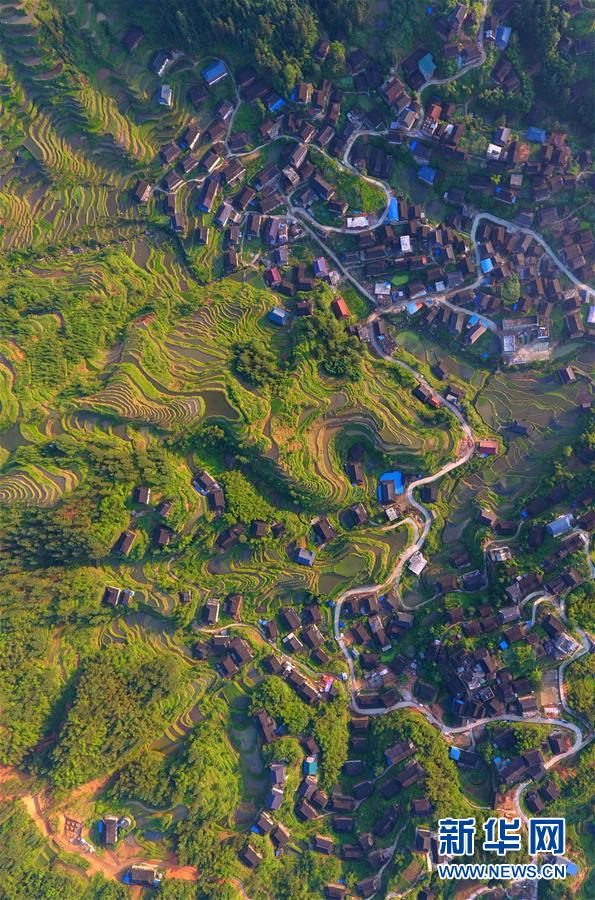 6月2日无人机拍摄的广西融水苗族自治县杆洞乡锦洞村的苗寨梯田。 新华社记者 黄孝邦 摄