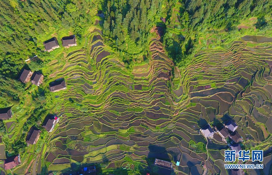 6月2日无人机拍摄的广西融水苗族自治县杆洞乡杆洞村的梯田。 新华社记者 黄孝邦 摄