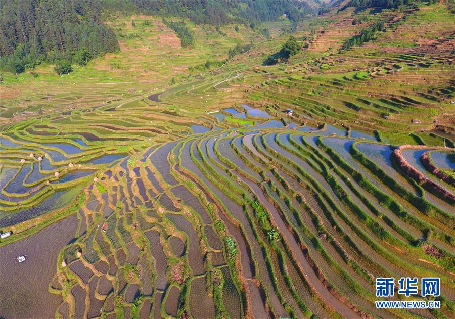 6月2日无人机拍摄的广西融水苗族自治县杆洞乡杆洞村的梯田。 新华社记者 黄孝邦 摄