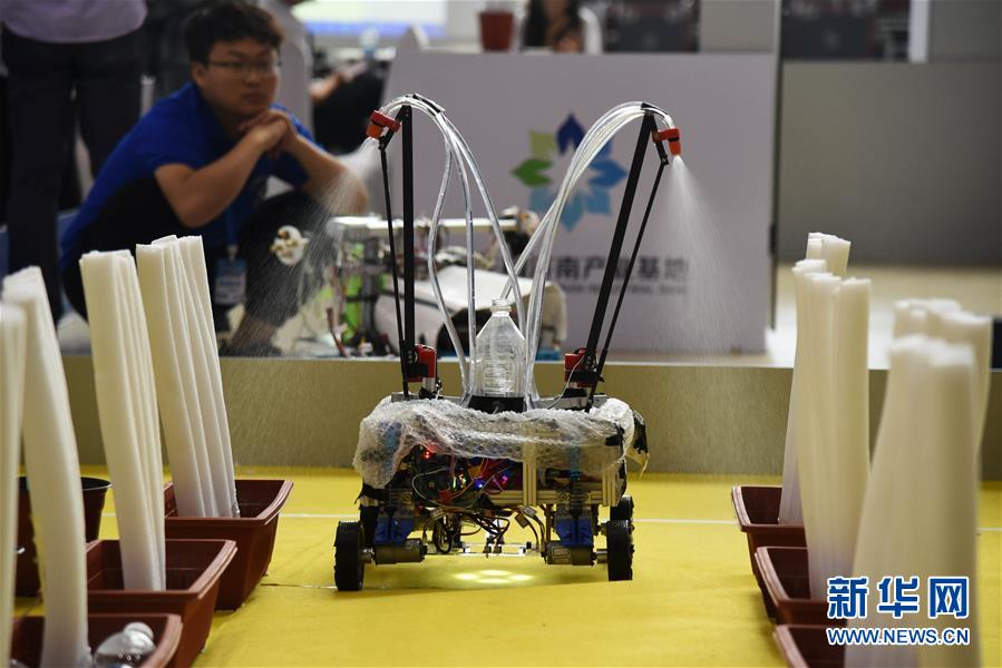 6月2日,西北农林科技大学的农业灌溉机器人在比赛中。 当日,2019“中关村(济南)产业基地杯”中国服务机器人大赛进入第二天的比赛,参赛选手们在农业灌溉、农业授粉、智能识别等项目中进行比拼。 新华社记者 王凯 摄
