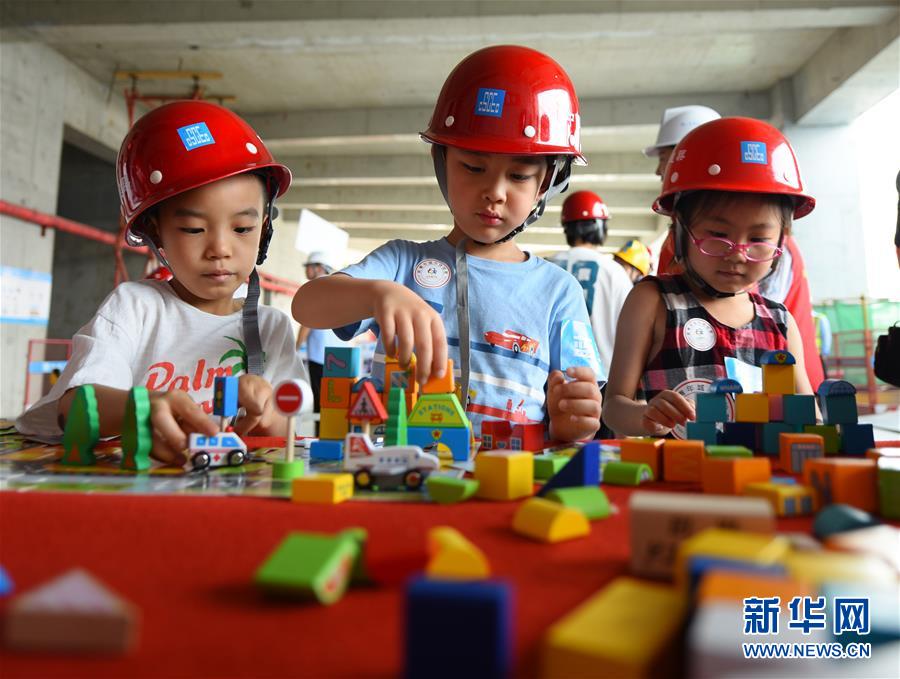 6月2日,在中建二局三公司位于北京丰台区的一处项目工地,小朋友体验“建房子”游戏。 当日,第四届“首都国企开放日”活动在北京举行,众多市民走进数十家企业进行参观体验。 新华社记者 任鹏飞 摄
