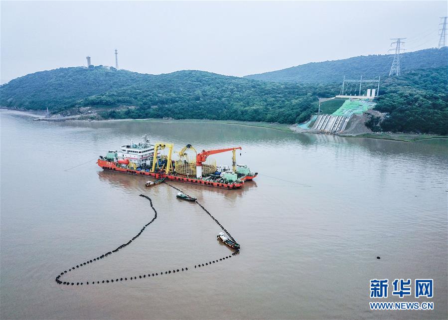 6月2日,最后一段海底电缆从海缆施工船上缓缓拖向舟山大鹏山岛的终端站(无人机拍摄)。新华社记者 徐昱 摄
