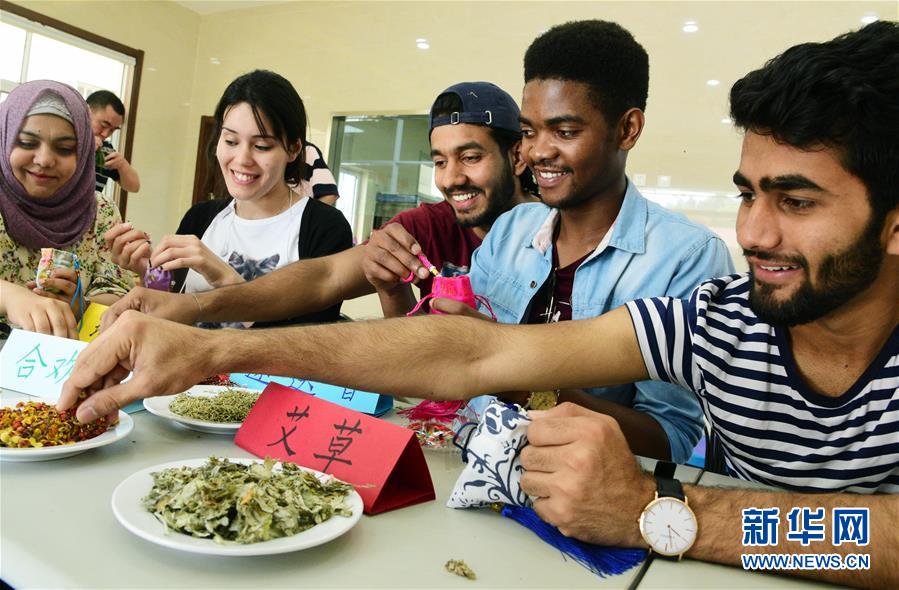 6月2日,在江苏省镇江市金江社区,来自江苏大学的留学生在体验制作香囊。