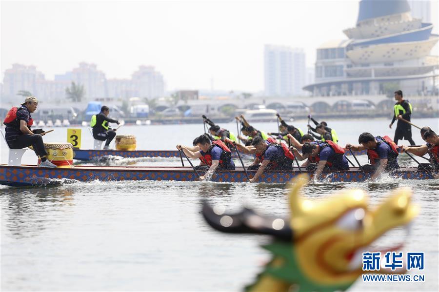 6月2日,人们在山东省临沂市举行的龙舟赛上比拼。