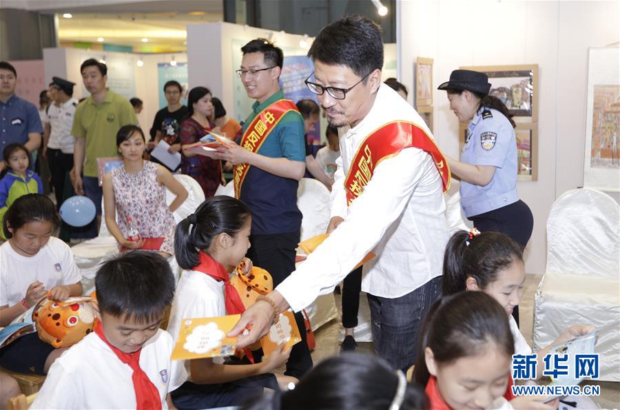 6月2日,担任防拐义务宣传员的演员于震等在活动现场向小朋友发放礼物。