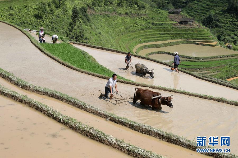 6月2日,在贵州省黔东南苗族侗族自治州榕江县八开镇党央村,村民在田间劳作。