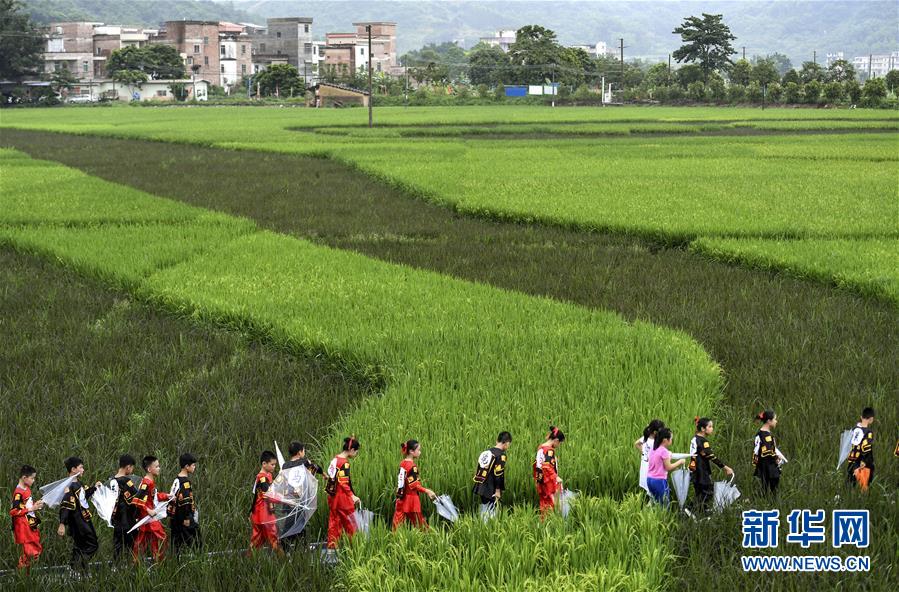 6月2日,一群小朋友在罗洪村参观稻田画。
