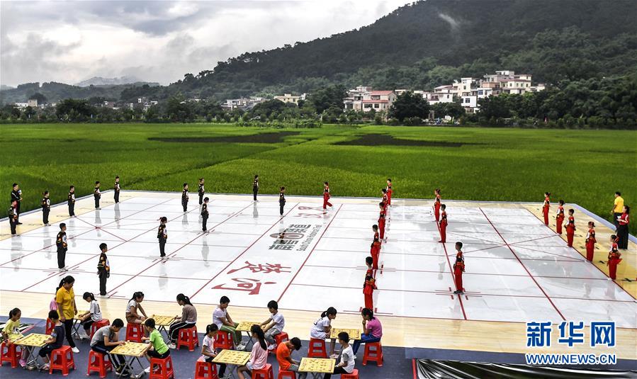6月2日,小学生们在稻田里的“大地棋盘”上举行一场别开生面的象棋博弈。
