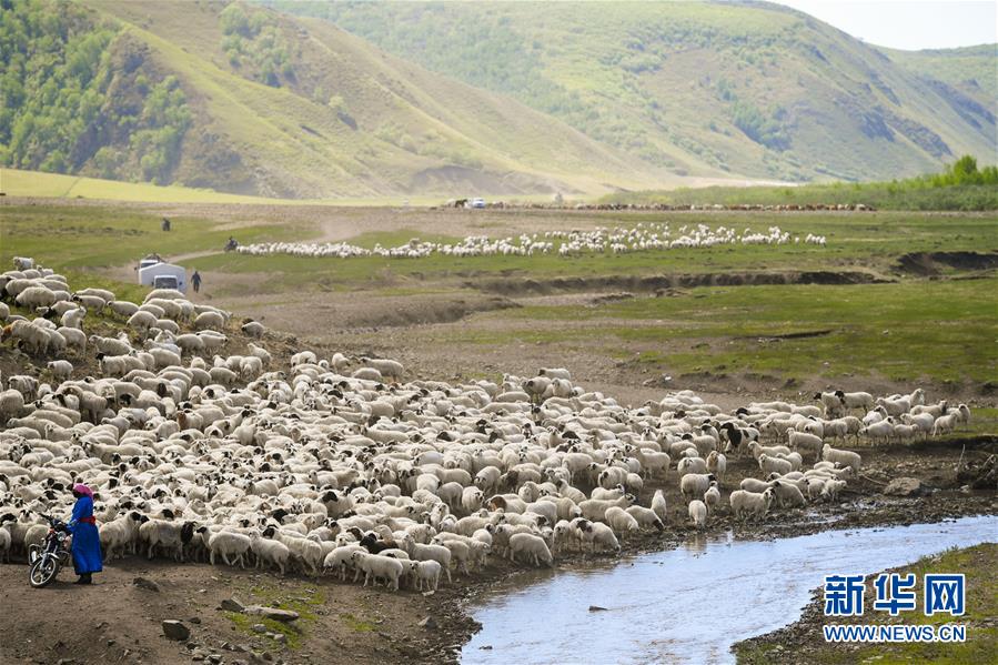 6月1日,牧民在阿鲁科尔沁草原上放牧。