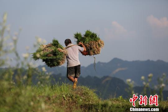 图为6月2日,一名农民挑着秧苗走在田埂上。 黄晓海 摄