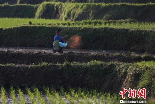 图为6月2日,一名农民在水田中施农家肥。 黄晓海 摄