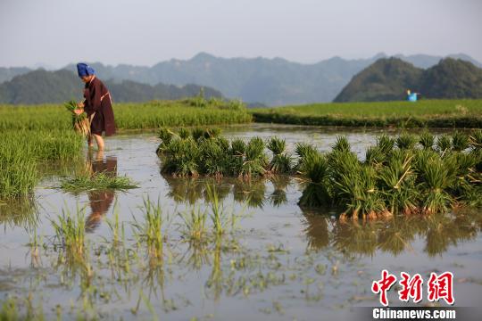 芒种时节临近,贵州省黔东南苗族侗族自治州丹寨县农民抢抓晴好天气,开展犁田插秧农事,田间到处一派繁忙。