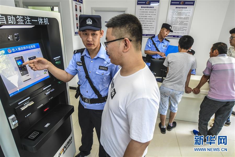 6月3日,河北省廊坊市广阳区环岛警务站民警为群众讲解自助签注一体机使用方法。 河北省廊坊市从今年以来启动街头智慧便民警务站建设,将巡逻盘查、接警处警、交通管理等职能整合到警务站中,同时各警务站还根据实际工作需要配备了二代身份证补换、交通违法处理、出入境证件签注等自助设备终端。据悉,廊坊市将在6月底前完成警务站一期建设任务。 新华社记者 李晓果 摄