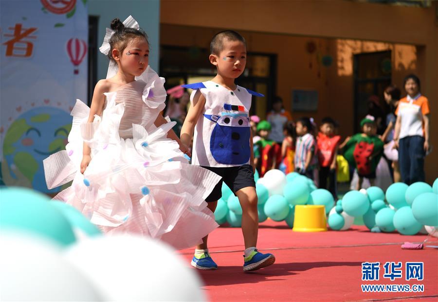 6月3日,紫竹苑幼儿园的孩子们在进行环保时装秀。 当日,为迎接世界环境日,安徽省合肥市常青街道竹西社区联合紫竹苑幼儿园开展“爱护环境 从小做起”主题教育活动,通过开展环保主题绘画、环保时装秀、垃圾分类环保小游戏等活动,帮助孩子们从小树立节约资源、爱护环境的意识。 新华社记者 刘军喜 摄