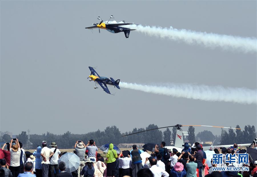 6月3日,在第十一届安阳航空运动文化旅游节开幕式上,航空运动爱好者进行飞行特技表演。 新华社记者 李安 摄