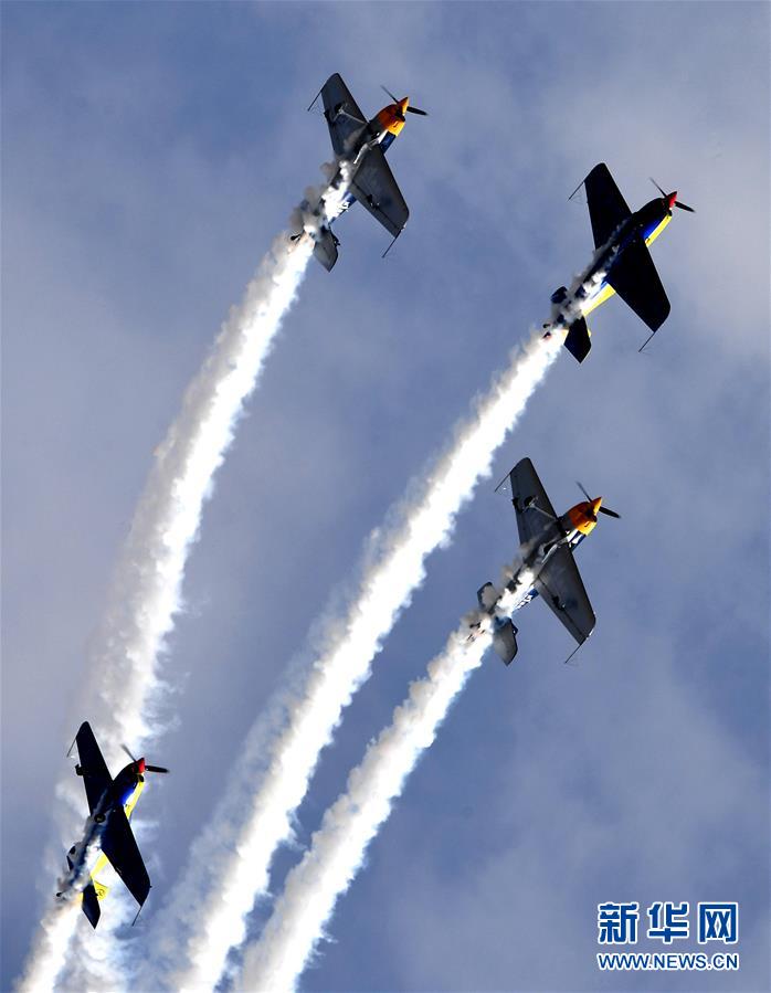 6月3日,在第十一届安阳航空运动文化旅游节开幕式上,航空运动爱好者进行飞行特技表演。 新华社记者 李安 摄