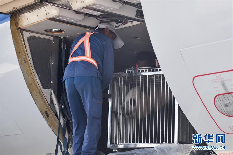 6月3日,在青海省西宁曹家堡机场,机场工作人员在搬运大熊猫。 新华社记者 吴刚 摄