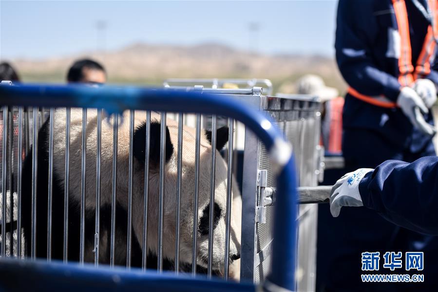 6月3日,在青海省西宁曹家堡机场,机场工作人员在搬运大熊猫。 新华社记者 吴刚 摄