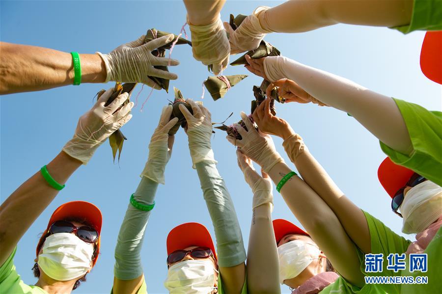 6月3日,在包粽子活动现场,人们展示亲手包好的粽子。新华社发(雷勇 摄)