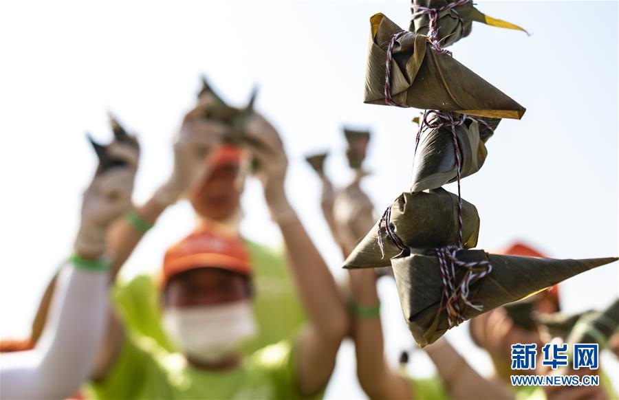 6月3日,在包粽子活动现场,人们展示亲手包好的粽子。新华社发(向红梅 摄)
