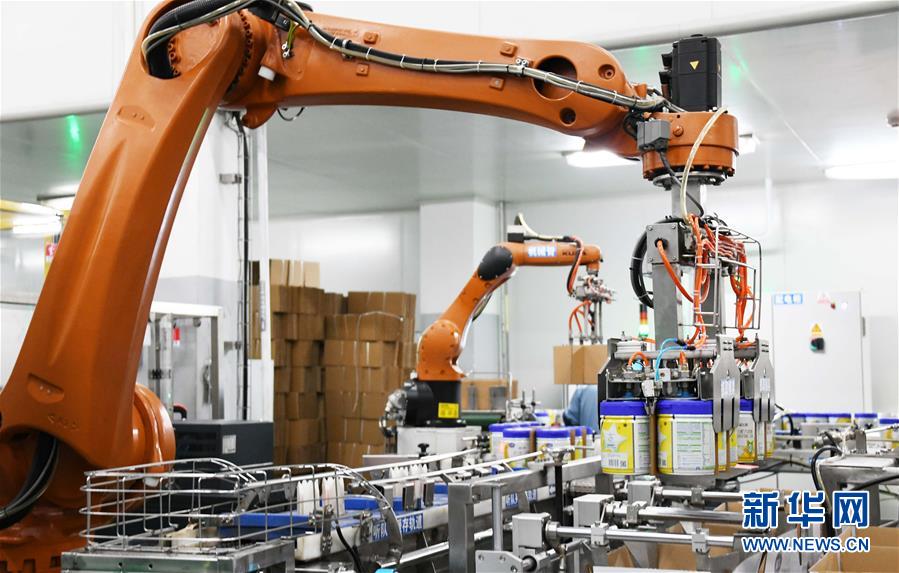 在飞鹤(甘南)乳品有限公司的外包装车间,机械臂在进行包装生产(2018年10月30日摄)。新华社记者王建威摄