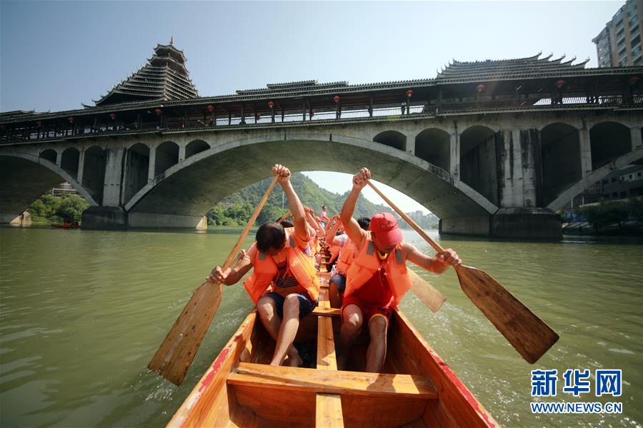 6月3日,在贵州省铜仁市玉屏侗族自治县舞阳河上,龙舟队进行训练。 端午将至,人们参加多彩民俗活动迎接传统节日的到来。 新华社发(欧秀灯摄)