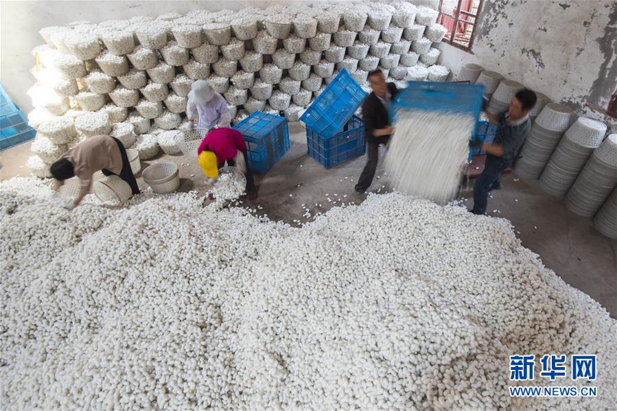 6月3日,在江苏海安大公镇蚕茧收购点,工作人员将蚕茧分类堆放。 日前,江苏海安迎来蚕茧收获季,收购点陆续开秤收购春茧。海安市现已拥有真丝家纺、化妆品、艺术品等完整的茧丝绸生产加工产业链,以此助力农民增收、工人就业。 新华社发(徐劲柏 摄)