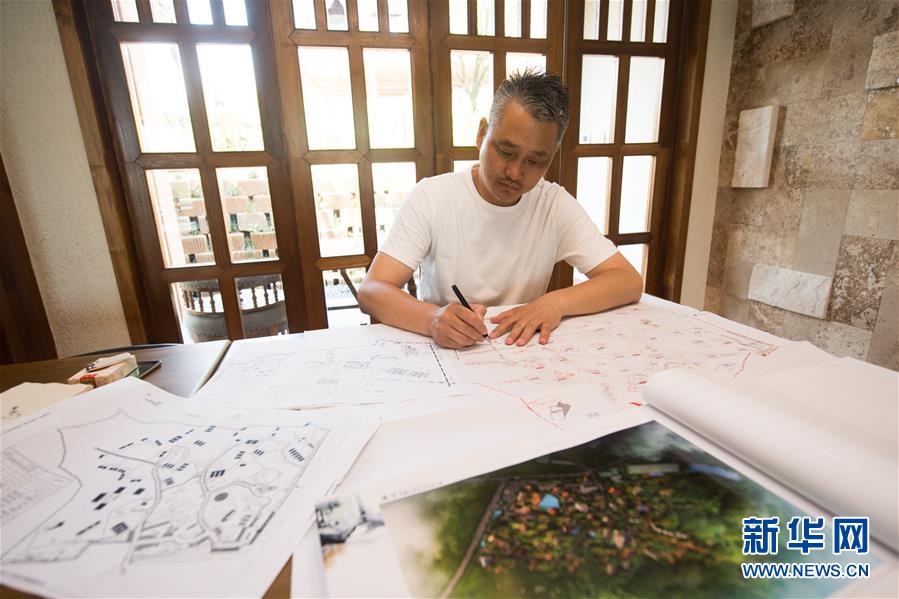 6月4日,陈谷在“小瘾·半日村”内整理民宿村的设计图纸。新华社记者翁忻旸摄