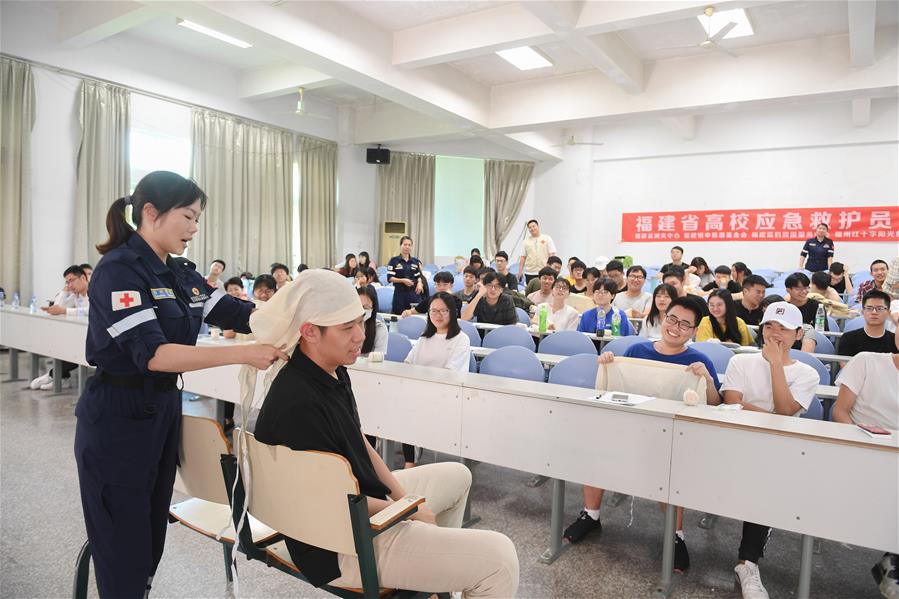 6月4日,在福建省福州市闽江学院,救援人员向学生示范头部包扎要领。 近日,福建省减灾中心联合多方社会救援力量,在省内多所高校陆续举办防灾减灾应急救援培训,培养高校应急志愿者队伍。 新华社记者 宋为伟 摄