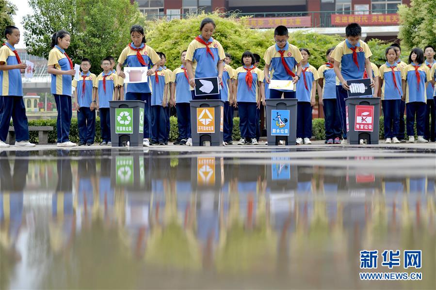 6月5日,河北省邢台市第十中学学生将代表不同种类垃圾的卡片投入标有垃圾分类标志的垃圾桶。 新华社记者 牟宇 摄