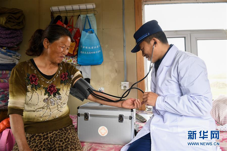 奇乾中队队医为营地附近仅有的几户村民测量血压(5月19日摄)。新华社记者 刘磊 摄