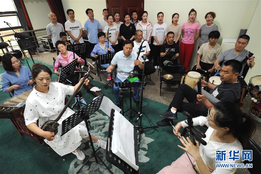 6月4日,山东省滨州市沾化渔鼓戏剧团演员在排练新编渔鼓戏剧目《老邪上任》。 新华社发(刘玉和 摄)