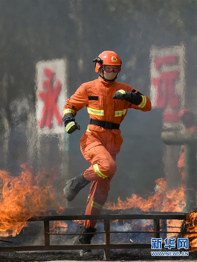 6月5日,在呼和浩特市内蒙古森林消防总队教导队,新入职的消防员在模拟火场环境中跨越火栏。新华社记者 彭源 摄