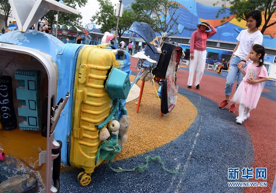 当日,为迎接世界海洋日,青岛市“守护蔚蓝海洋,我们共同行动”海洋垃圾作品展在青岛海昌极地海洋公园举行。参展作品均出自环保志愿者之手,作品原材料都是从海里打捞上来的垃圾。 新华社记者 李紫恒 摄